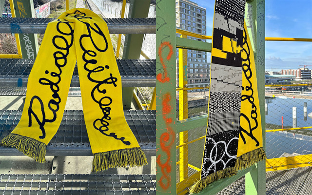 Keeping you warm on windy days and frosty nights: the official Radio Ruit scarf! Black, white, grey and bright yellow come together nicely in this two-sided collaboration, designed by Linnea Lindgren and Dorian Scheerlinck.